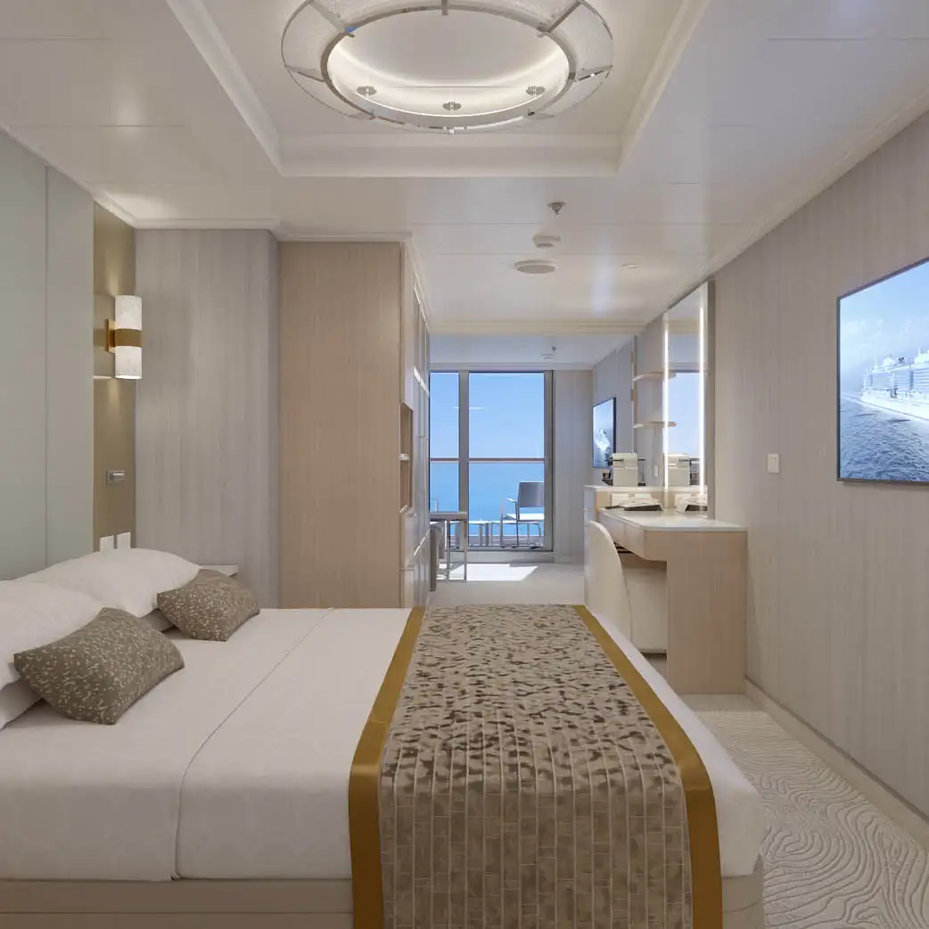 Nuestras Suites representan el alojamiento más suntuoso a bordo, diseñado como su oasis privado. Disfrute de amplios camarotes, balcones de gran tamaño y vistas espectaculares, creando su refugio personal con el océano como telón de fondo.