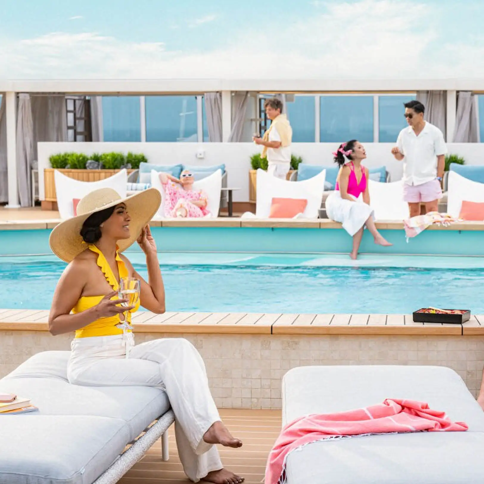 Al reservar, desbloquea un servicio superior y comodidades premium, incluyendo una botella de burbujas de cortesía para brindar al embarcar. Disfrute de privilegios exclusivos como acceso a su restaurante privado y al sereno Sanctuary Club.